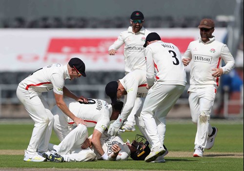The left-hand opener fiercely drove an Anderson delivery off the back foot that smashed into Dane Vilas at silly point and somehow the Lancashire captain clung onto the ball.
