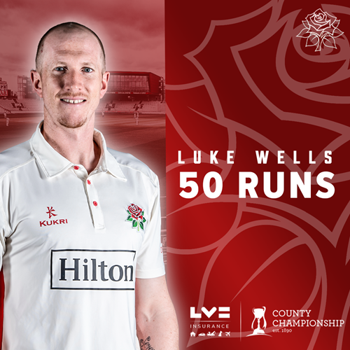 Luke Wells has greeted the introduction of Josh Shaw into the attack with two on-drives for four followed by a pair of straight and off drives to the boundary two overs later off the same bowler as this Red Rose pair have prospered during the opening hour with a 50 partnership off 90 balls.