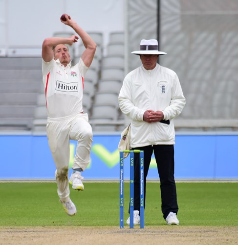 Double bowling change as Lancashire hunt a second wicket with Matt Parkinson and Luke Wood into the attack.
