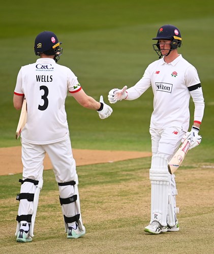 Another reverse sweep for four off Leach took Wells to a 78-ball half-century, featuring 8 fours and 2 sixes. He then collected a third maximum by hitting the spinner back over his head and another boundary in the same over brought up the century partnership.