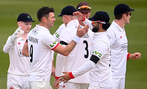 The day began well for Lancashire with two quick wickets, Anderson having Rew caught behind with only three added to his overnight score and pinning Lewis Gregory lbw for five.