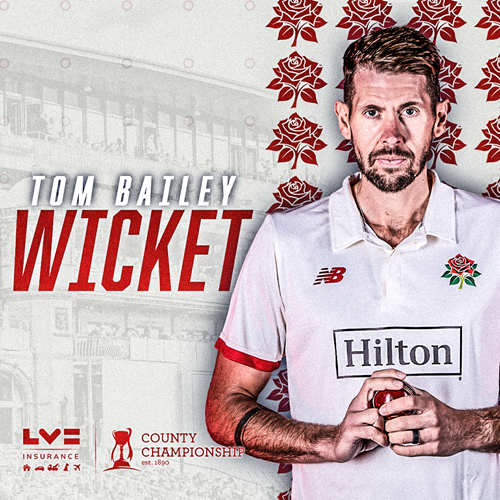 Tom Bailey has his 15th five-wicket haul after trapping Sam Cook lbw for 5.