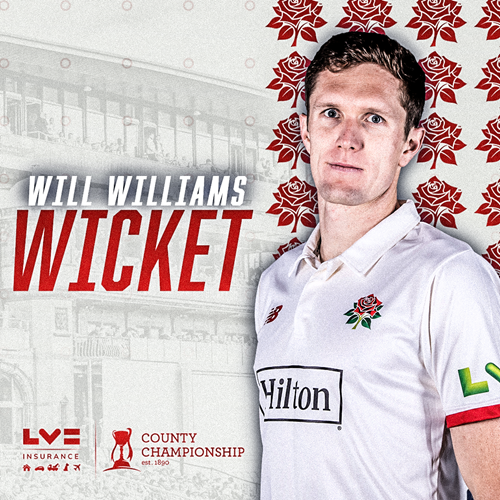 Lancashire finally have a breakthrough 30 minutes after lunch as Ryan Higgins gets a big inside edge off Will Williams to deflect the ball onto his leg stump.
