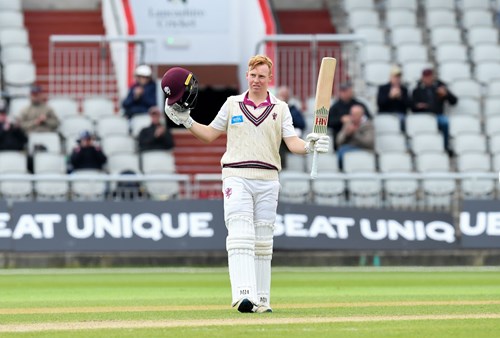 James Rew struck a fine century, his second against Lancashire this season, and shared a century partnership with Kasey Aldridge, to shift the momentum Somerset’s way on the second day of this LV= Insurance County Championship match at Emirates Old Trafford.