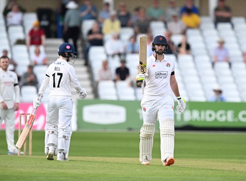 Lancashire’s double setback meant two new batters at the crease, but with Bruce taking the lead, reaching a half-century off 69 balls, it took the second new ball for Nottinghamshire to restore a measure of parity on the day, Pennington striking twice in the space of nine deliveries as George Bell edged to first slip and Matthew Hurst to third.