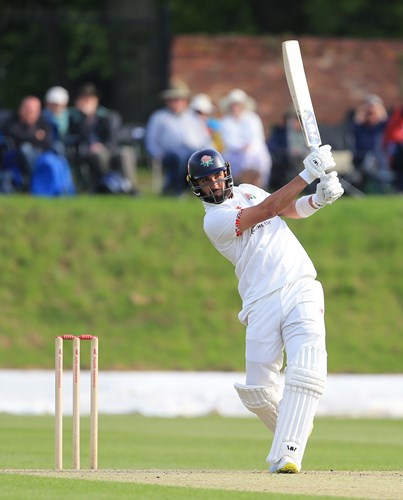 Alex Lees inside edges onto his pad with the ball carrying through to 'keeper Matty Hurst.
