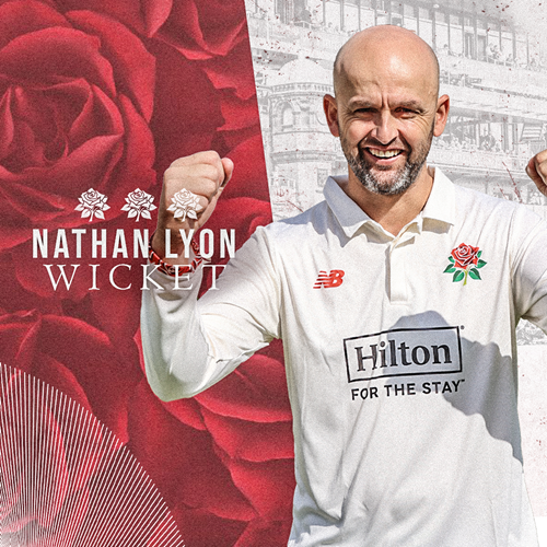 Joe Denly is tempted into hitting a big shot off Lyon but he doesn't clear the fielder at long on, who happens to be a delighted Red Rose skipper Keaton Jennings who takes the catch.