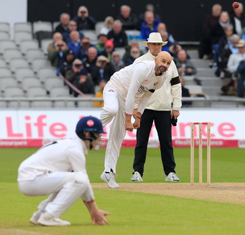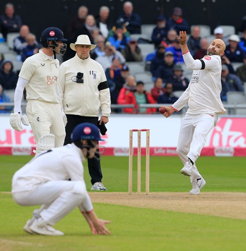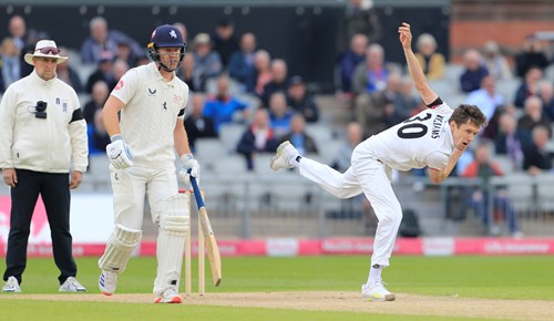 Tom Bailey starts with a maiden to Ben Compton from the Brian Statham End with Will Williams about to bowl to Zak Crawley.