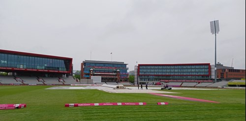 Meanwhile the rain has stopped and the groundstaff are removing the covers.