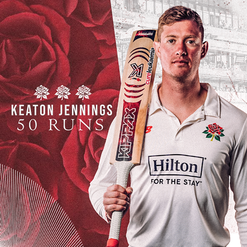Keaton Jennings reaches his fifty from 65 balls by cutting Brett Randell for his ninth four, and then adds 3 more to reach 1,000 runs for the season!