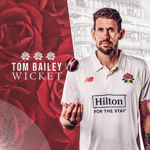 Brilliant by Tom Bailey who floats up a slower ball that completely deceives Craig Overton who plays at it miles too soon and is lbw for 2.