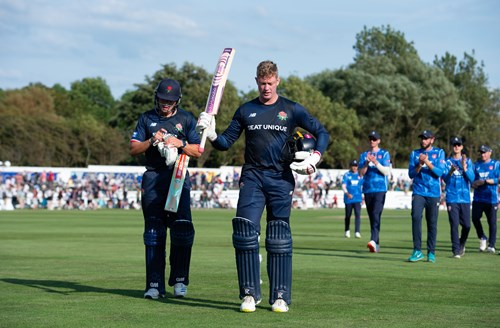Jack Blatherwick hit a brace of sixes off Jack Leaning that meant a very gettable 47 runs were required from the final 10 overs but Lancashire started running out of wickets.