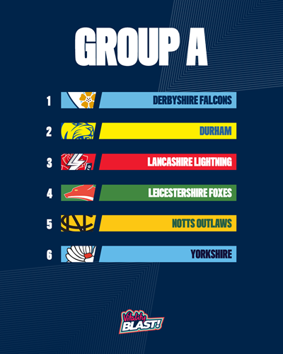 Group A: Derbyshire Falcons, Durham, Lancashire Lightning, Leicestershire Foxes, Notts Outlaws, Yorkshire.