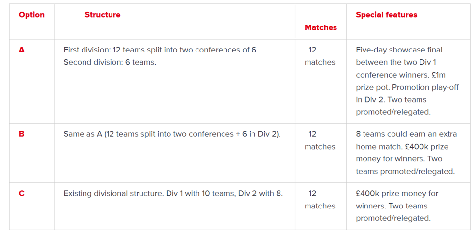 As a result, we now are seeking Members’ views on proposals presented by the Professional Game Committee and to vote according to preference with a deadline of midnight on Wednesday 16 July 2025 as follows.