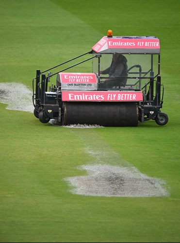 The rain has stopped and the sun is shining, so the groundstaff are mopping up once more.
