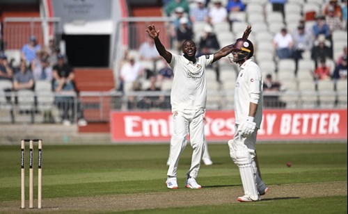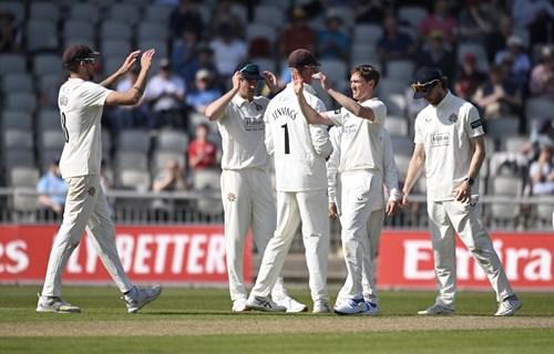 Tom Hartley comes on for his first bowl this season as we approach lunch. George Balderson is also back in action for a second spell and has had a big lbw shout turned down against Luke Procter in his previous over.
