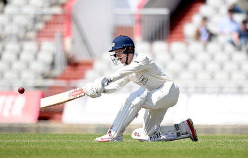 Tom Hartley drives Martin Andersson off the back foot for four to bring up the 50 partnership from 111 balls and also pass the landmark of 1,000 first-class runs.