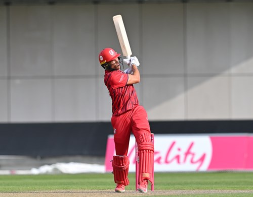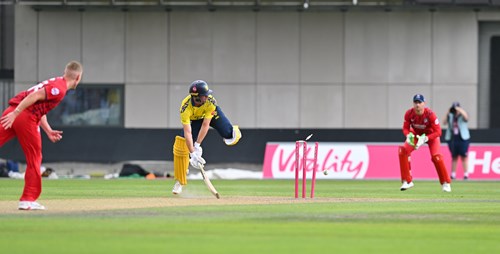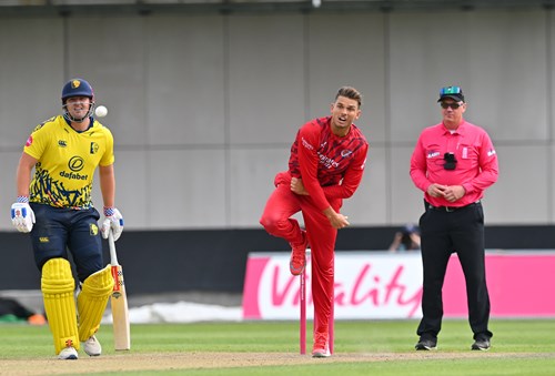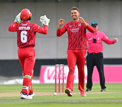 Graham Clark was nicely caught by James Anderson at mid-off diving to his left off Luke Wood for 13, David Bedingham was neatly stumped down the leg side by Jos Buttler for 12 off Chris Green who next took a return catch to send back Alex Lees for 11 leaving the visitors in early difficulties on 46-3.