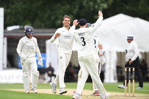 The Red Rose attack fought to restrict the scoring and that brought reward five minutes before tea when Muyeye attacked Balderson but skied a catch to Stanley at cover to be out for an attractive 63.