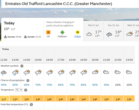 With the changeable weather and varying forecasts in Manchester over the next few hours, this page will keep you up to date with the latest conditions at the ground ahead of the scheduled start of play.