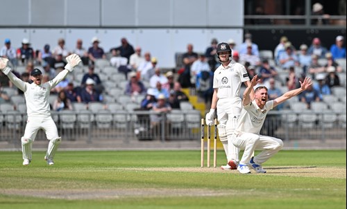 Charlesworth had produced a number of fierce pulls for four in advancing steadily through the afternoon to reach 43 until he was deceived by a nicely flighted delivery from Tom Hartley to drive a catch back to the bowler just before tea.